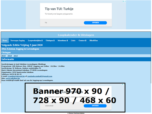 Een banner van 728 pixels breed en een hoogte van 90 pixels, een banner van 970 pixels breed en een hoogte van 90 pixels aan de bovenzijde van de website of een banner van 468 pixels breed en een hoogte van 60 pixel. Deze wordt vertoond op 90% van de pagina's van Sportsites.be . Bekijk hieronder een voorbeeld. De grootte van de weergave is afhankelijk van het apparaat en schermgrootte waarmee de website wordt bezocht.
